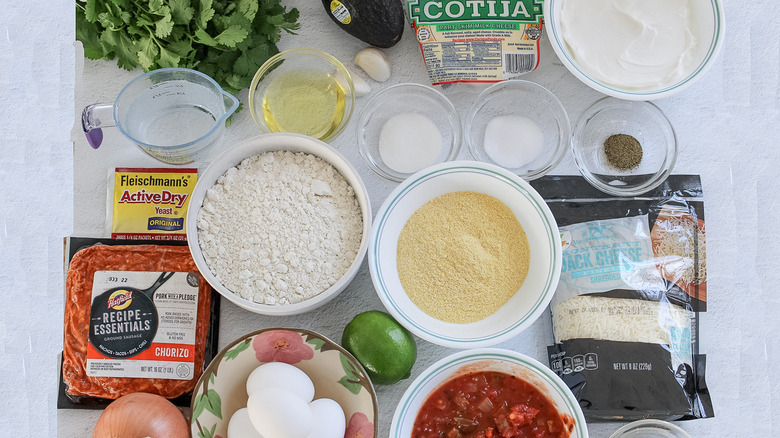 Since you'll be making the dough, the list for this recipe is pretty long but it's totally worth. You will need warm water, active dry yeast, granulated sugar, olive oil, all-purpose flour, cornmeal, salt, olive oil, onion, black pepper, and minced garlic. For the pizza toppings and sauce, be sure to get Mexican chorizo, eggs, salsa, shredded Monterey jack cheese, sour cream, mayonnaise, cilantro, lime juice, lime zest, cotija cheese, and an avocado.