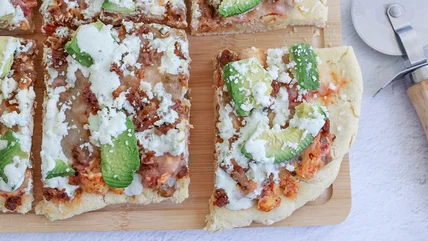 - Once the pizza is baked, spoon the cilantro lime crema over the pizza, top with the sliced avocado and sprinkle the cotija cheese over everything. Cut and serve warm.