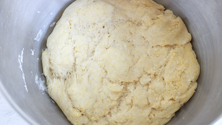 - In the bowl of a stand mixer with dough hook attachment, add the flour, cornmeal, and 1 teaspoon of salt. Mix together for about 30 seconds. With the mixer still running on low, add in the yeast mixture. Mix until the dough forms a ball and pulls away from the side of the bowl.