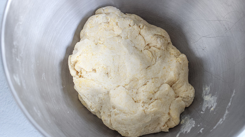 Grab a stand mixer and remove the bowl. Add the flour, cornmeal, and 1 teaspoon of salt. Turn the mixer on low and mix everything together for about 30 seconds. Then, add the yeast mixture to the same bowl and continue mixing on low until the dough forms a ball and pulls away from the sides of the bowl. Morone says you "can swap out the cornmeal pizza crust with pizza dough you buy at the store to save a little bit of time."