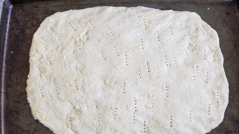 - Prick the dough all around with a fork and bake in the preheated oven for 10-12 minutes, until it just starts to turn golden brown.