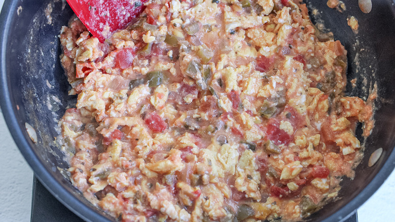 - Once the eggs are almost fully cooked, add the salsa to the pan with eggs. Stir the salsa and eggs together until combined and continue cooking until the eggs are just cooked.