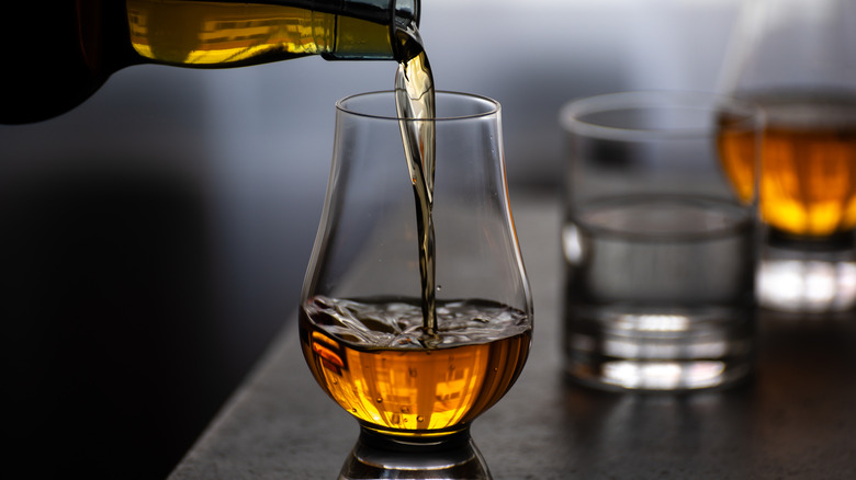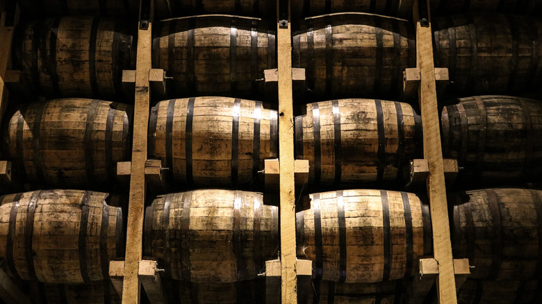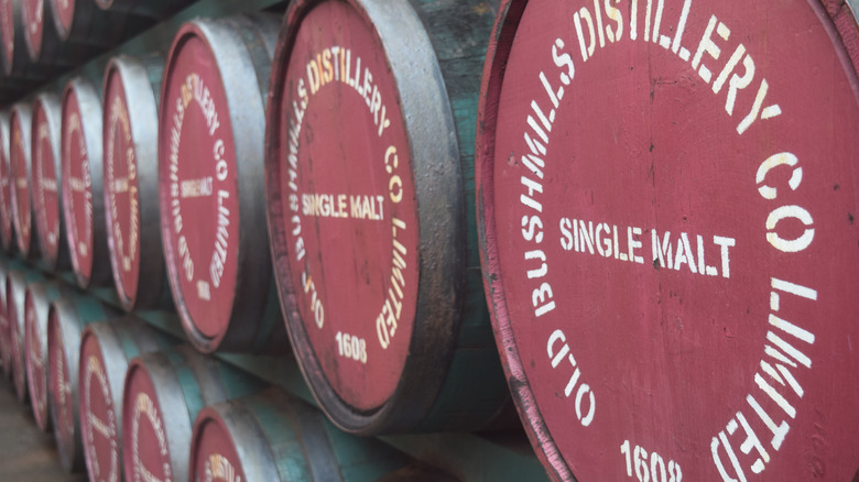 Before bourbon goes into them, the barrels are made from oak and then charred on the inside. Once they're ready, they're filled with the distilled corn-based liquor and stored for at least two years, but likely many more. The bourbon is then released, and the barrels make their way across the Atlantic, where they'll be used for Irish whiskey. While the barrels are secondhand, Irish distillers aren't buying them to save money. The used casks actually contribute a lot to the Irish whiskey's final flavor. Notes of citrus, vanilla, and caramel from both the oak and the bourbon that soaked into it make their way into the Irish whiskey as it matures. So although it has to be brewed, distilled, and aged in Ireland, there's a little taste of The States in many glasses of Irish whiskey.