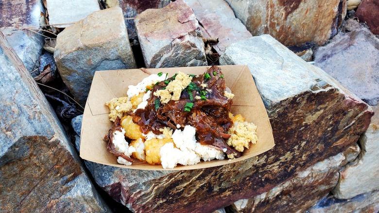 When it comes to potatoes, nothing beats the tater tot. They're small cylinders of chopped potato that are seasoned and deep-fried to crispy perfection. They really are the best way to eat a potato ... unless you smother them in shredded beef and gravy. And that's exactly what they are like this year for the Food & Wine Festival. While we could've gobbled up this whole dish ourselves, there's more than enough to share with at least one other person.