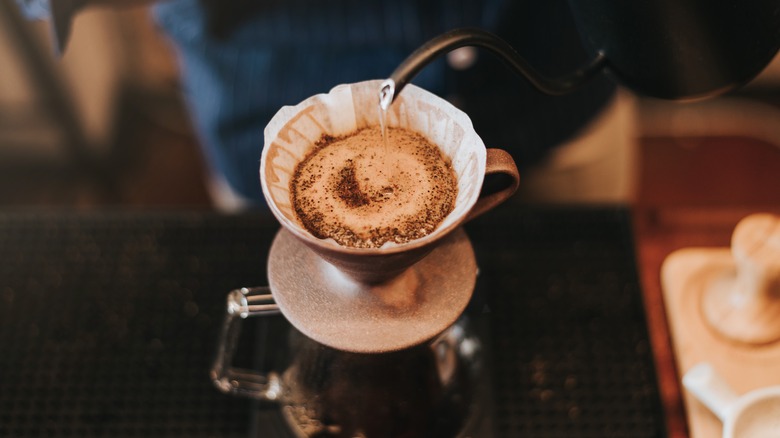 Blooming a pot of coffee means using a small amount of boiling-hot water to "pre-infuse" ground coffee beans before a full brew, especially when using pour-over or French press methods. Steeping for 30 to 45 seconds releases carbon dioxide that occurs during the roasting process, which can leave a bitter or sour taste if not removed. You'll see the CO2 gasses escaping through bubbles and foam on the water's surface.