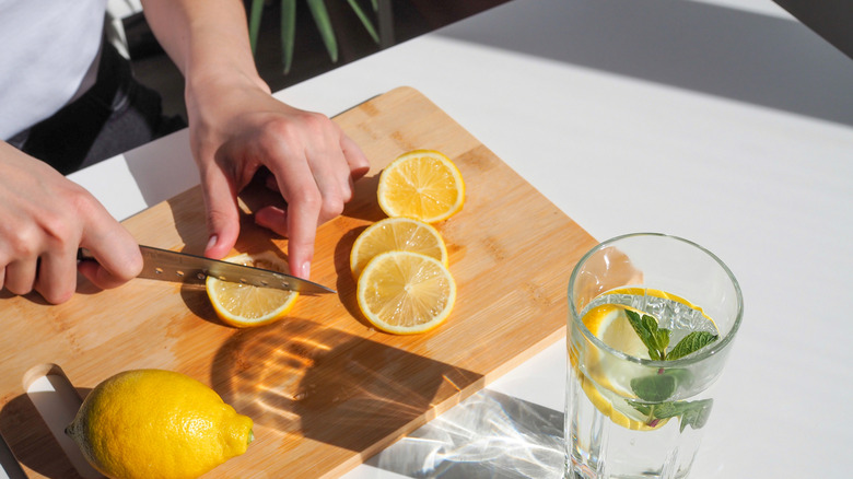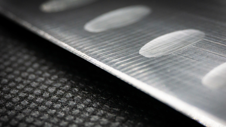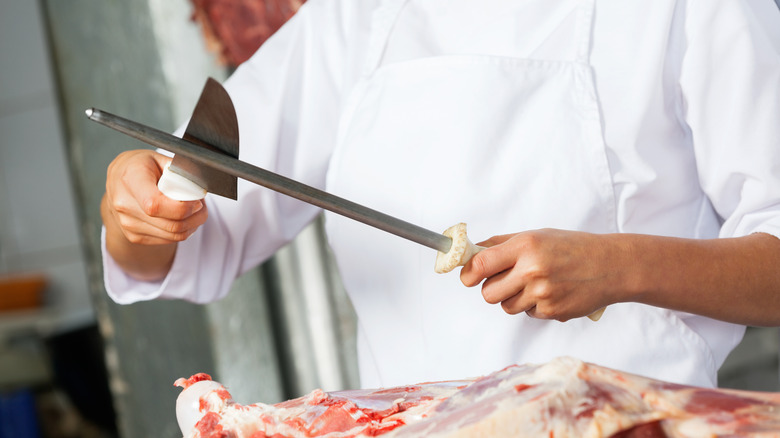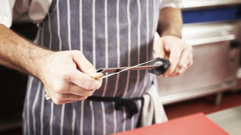 Knowing exactly when to sharpen your knife can be tough to identify if you aren't experienced. Luckily, there is a sound that's a sign it's time to sharpen your knives. Maybe you've never thought twice about that crunching sound when chopping vegetables, but a super-sharp knife should glide through onions and peppers without making much of a sound. If you feel resistance as you try to cut and hear some crunching, it's probably time for a sharpening. Other veggies can help test the sharpness of your knives, like tomatoes. If the blade easily slices through the skin, it's plenty sharp.