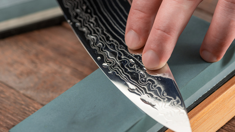 Honing and sharpening are often confused with one another, and while both do add to the feeling of sharpness on a blade, sharpening should be reserved for use only when necessary. "The process of 'sharpening' a blade entails removing a small amount of steel from the cutting edge of the knife and recreating a sharp new edge bevel," says Field. This can be done on a mechanical grindstone, a whetstone, or using a manual pull-through sharpener.