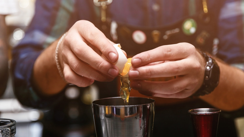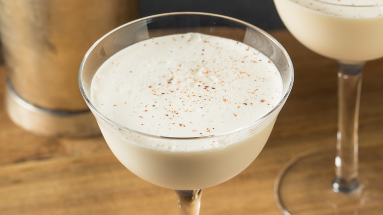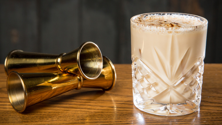 Retired major Michael Boire referred to moose milk as "high-propulsion eggnog" when talking to Imbibe Magazine. The idea behind the cocktail is that it is so loaded with booze and sweets that the effect on the drinker is something akin to burning jet fuel. Eggnog originated in medieval Britain and quickly became associated with Yeultide wishes of good health, prosperity, and merriment. A simple combination of egg yolks, milk, sugar, and some kind of alcohol, eggnog traveled with the British to the North American colonies, where it naturally engrained itself amongst the farming colonists. It's this traditional winter drink, the central core of the moose milk cocktail, providing it with its indicative creamy color and frothy texture.