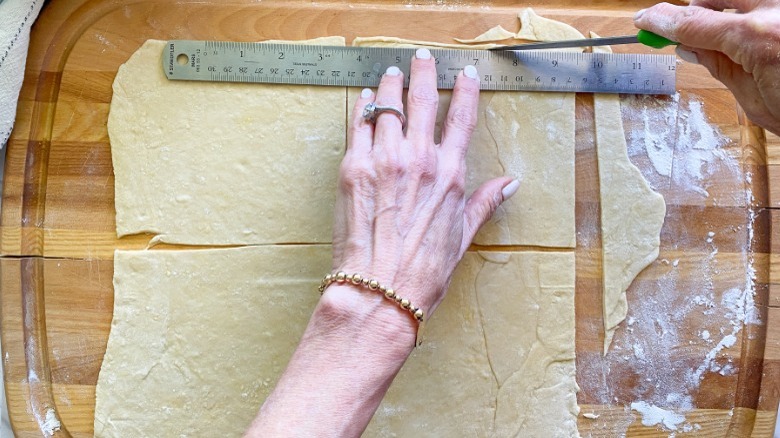 Now we need to trim the dough into squares, so it's ready to use. "I like to make the wrappers 6x6-inches so that I have enough room for about ¼ cup of filling. If you prefer to make mini eggrolls you can adjust the size," Hahn remarks. Take a metal ruler or another cutting board with a straight edge and trim off the rough border edges. Now measure out 6x6-inch squares and using a paring knife, cut them out. You should easily get four wrappers from each section of dough.