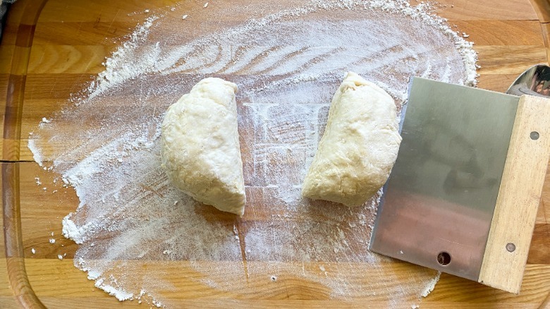 - Lay the dough out on a large cutting board dusted with flour and knead for about 3 minutes or until the mixture is well blended. Place the dough in a clean bowl and cover with plastic wrap. Let it sit for 30 minutes.