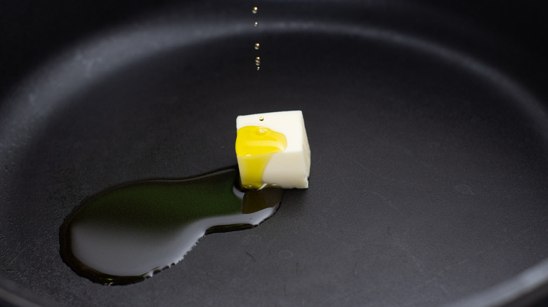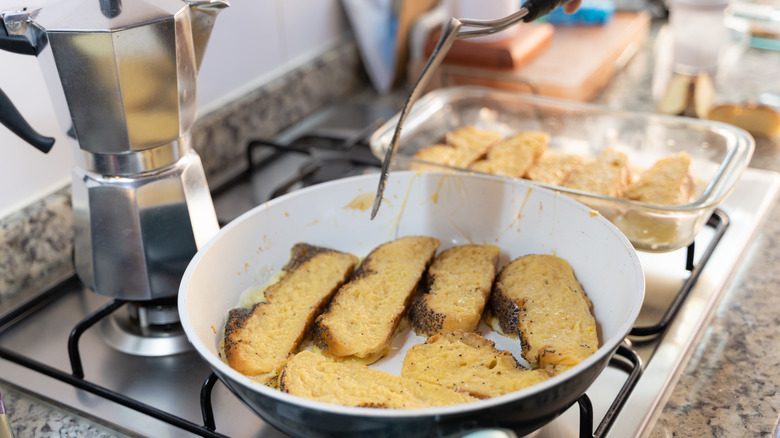 Another potential cooking oil for French toast comes courtesy of another breakfast favorite: bacon. When Chef Currence cooks for his 10-year-old daughter, he first cooks bacon in the skillet. Then, after removing some of the bacon greases, he'll transfer his soaked bread into the pan and cook the French toast. "You'll get some of the bacon flavor and pick up some of those caramelized bacon bits," Currence shares. Plus, you'll reduce the number of pans you must clean after breakfast. It's a win-win.