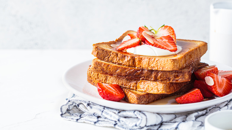 If you want more savory French toast with all of the chemical benefits of milk, you should substitute cream into the recipe instead. For more flavor, Alton Brown makes French toast using half-and-half instead of full-fat cream. Chef Currence seconds this, noting that choosing a higher-fat dairy product is all about the flavor. While he uses a 1-to-3 ratio of whole milk to eggs for most of his French toast recipes, he notes that using a higher-fat dairy product will mean you need even less dairy in the custard.