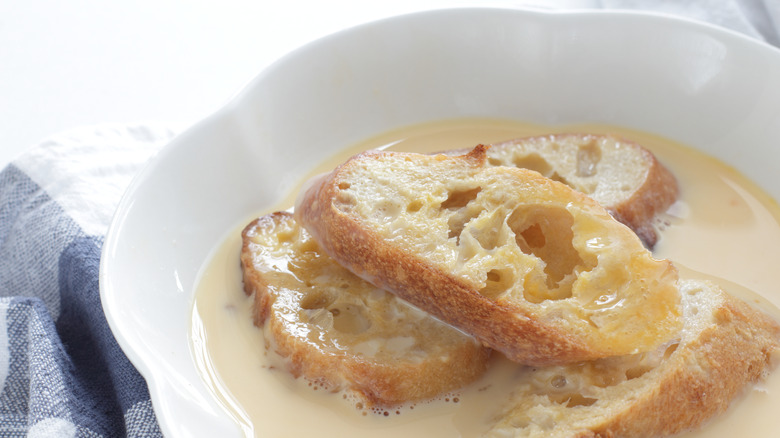 Chef Currence notes there isn't an exact science behind how long you should leave your French toast in the custard. The thickness of the bread, its dryness, and the texture of the bread can all affect how the bread takes up moisture. Therefore, feeling the bread is the best way to determine if you can remove your French toast from the custard.