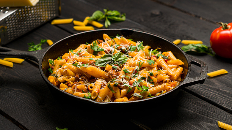 While you can't beat the time-saving ease of store-bought pasta, that doesn't mean you have to stay lost in the sauce. Laurentiis enhances the everyday ordinary by adding garlic, onion, reserved Parmesan rinds, fresh herbs, Calabrian chili paste, and butter. Any combination of ingredients has the potential to bring delicious newness to your pasta dish. Try sautéed garlic and onion, Kalamata olives, and rosemary for an extra punch of aromatic savoriness. And of course, ground meat is always a safe bet. That way, you'll avoid flavor fatigue and potential complaints from kids exclaiming "not pasta again!"