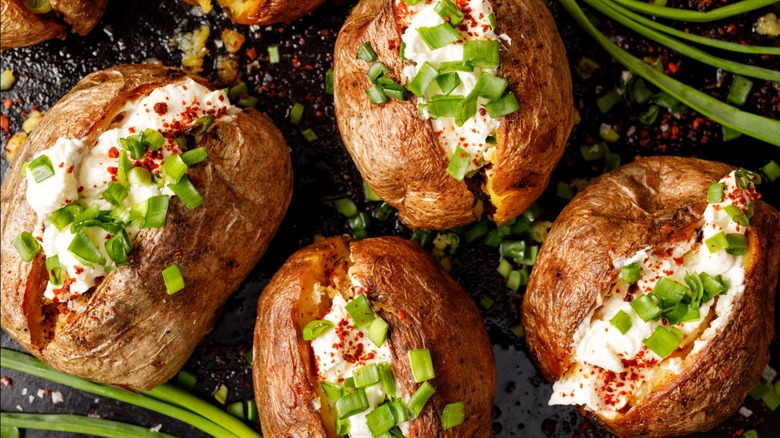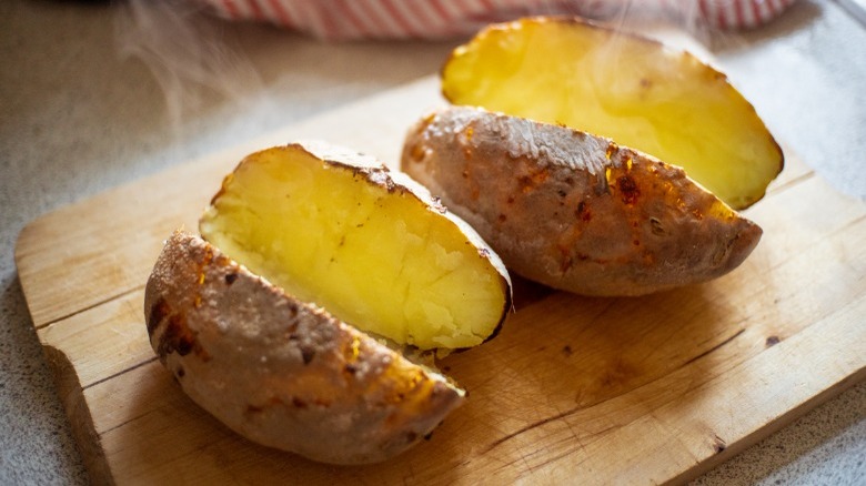 Martha Stewart is a big fan of this technique and swears by it for achieving the perfect baked potato. According to her, you should grab the freshly baked hot potato with a kitchen towel, then, using a pointed knife, make a shallow cut down the middle. The next step is turning the potato cut side down and smashing it on the counter with moderate force. The result is a baked potato that has its crispy skin intact, and all its tender insides fluffed up and ready to be doused in butter and mixed with your favorite toppings.