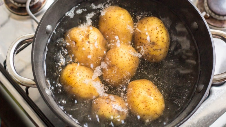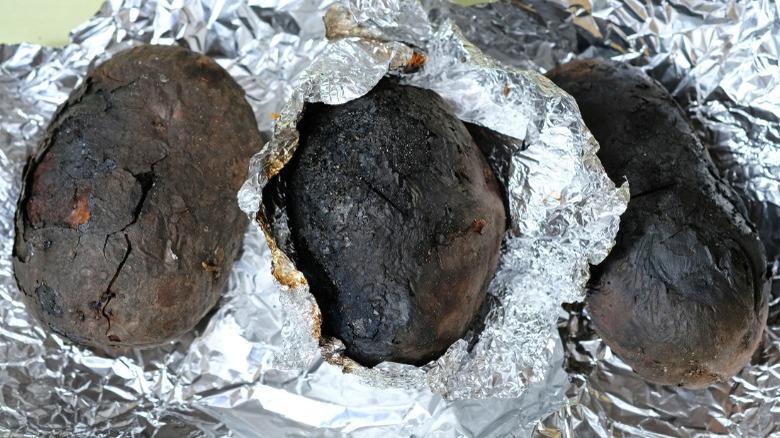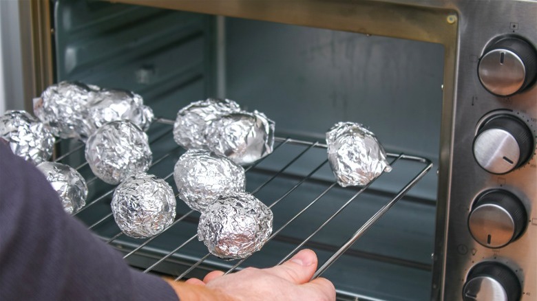 Wrapping potatoes in tin foil before cooking appears to be common sense — everybody and their mother seems to be doing it — until you realize it isn't. In fact, you should never bake a potato in aluminum foil unless you prefer it to be the direct opposite of baked and crispy. When potatoes are wrapped in foil, it creates a steaming effect that can make the skins soggy and prevent them from developing that crispy exterior that so many of us fondly associate with the dish.