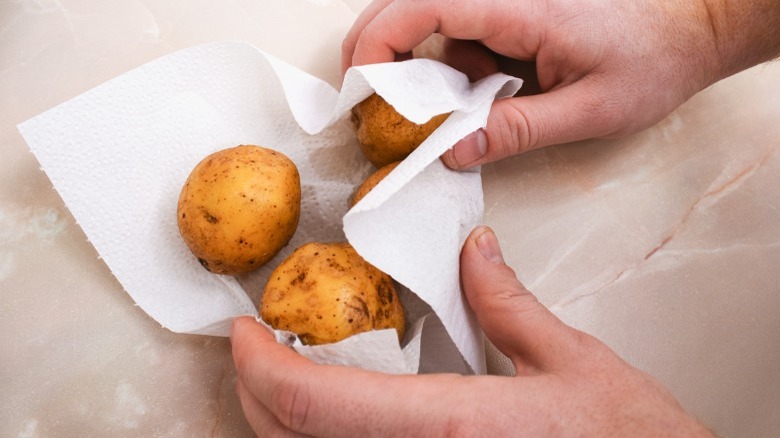 Once you are done with washing and brining, you need to take another essential (yet often overlooked) step that can help achieve the perfect texture. The reason you should dry your potatoes before baking is obvious — no one likes a limp-skinned spud, and that's exactly what you'll get if you fail to do so.