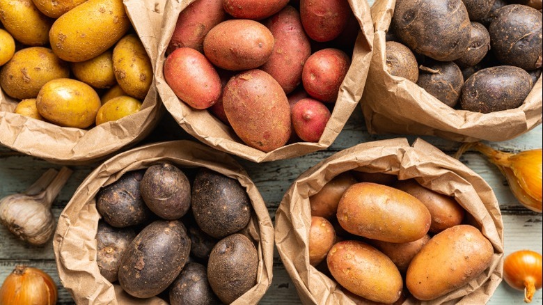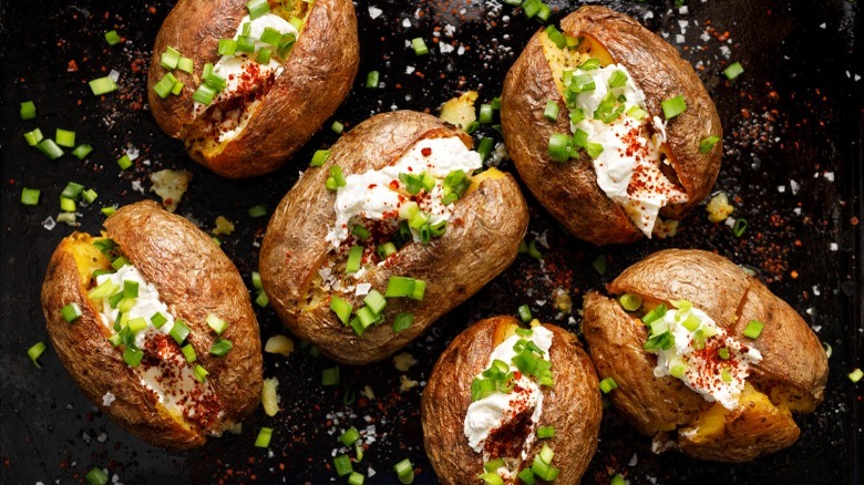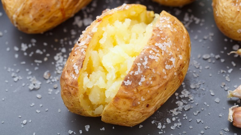 A good baked potato starts with a proper spud. Among the three general varieties — all-purpose, waxy, and starchy — the ones in the latter category are your best bet. An easy way to tell the difference between the potatoes you want and the ones that will be a disappointment is to check their size — the bigger they are, the more likely they're the starchy kind.