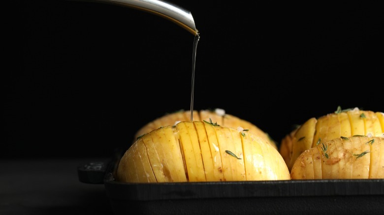 You should baste potatoes during baking as soon as the spuds reach the internal temperature of 205 to 212 degrees Fahrenheit. At this point, they will have crisped up enough on the outside, and you can reintroduce some moisture without making them soggy. This is the perfect moment to brush them with melted butter, olive oil, or another liquid of your choice and return them to the oven for 10 more minutes. The next time you make baked potatoes, remember to save the baste for last.