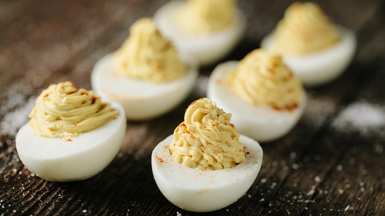 Deviled eggs are a beloved appetizer for holiday meals, sports events, potlucks, and more, but somehow there never seems to be enough yolky filling to go around. Especially those who adore generously topped deviled eggs will appreciate this instant mashed potato hack. Adding instant mashed potatoes to the egg yolk mixture extends the amount of filling giving it extra heft and richness along with a smooth, creamy texture. It's less likely to contain clumps than if using real mashed potatoes, and the mixture remains silky and easy to pipe onto each egg white. Whether you prefer traditional or more elaborate spins on the eggy appetizer, the mild potato flavor complements practically any ingredients you choose to customize and upgrade your deviled eggs.
