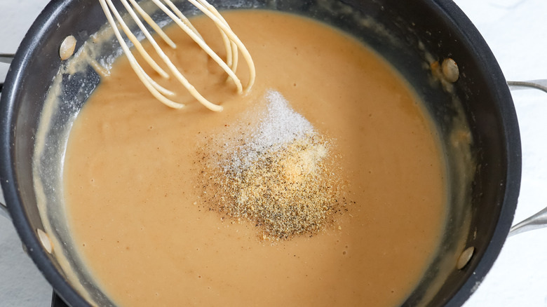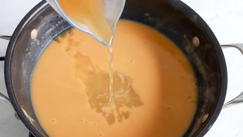 Once the roux has reached the optimal color, carefully pour in the chicken stock. Whisk the contents to eliminate any lumps, and cook the gravy for roughly 10 more minutes. You don't have to continuously stir it, but don't walk away — you want to ensure it reaches the right thickness without sticking to the bottom. Morone notes that "the longer you cook it the thicker it will get." In case it gets too thick, she recommends adding extra stock until the consistency is right.