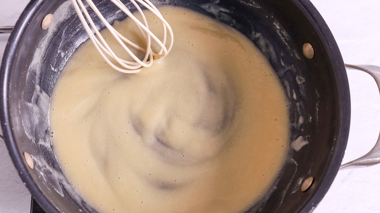 Keep whisking the mixture until the color starts to turn golden, "but not so long that it becomes a very dark brown because then it won't thicken as well," Morone warns. It should take around 10 minutes, so keep a close eye.