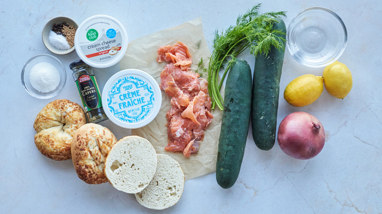 In addition to lox (or smoked salmon) and bagels, you'll need all of the aforementioned toppings. To make the pickles, you'll be using cucumbers, water, distilled white vinegar, sugar, salt, mustard seed, peppercorns, and fresh dill. For the cream cheese topping, you'll need cream cheese, crème fraîche, lemon juice, and some brine from a jar of capers. You will also need a red onion for the bagel sandwiches, and you might want some extra dill and some capers to add to the garnishes, although these last two additions are optional.