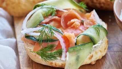 - Layer the salmon lox and sliced onion on top of each bagel.