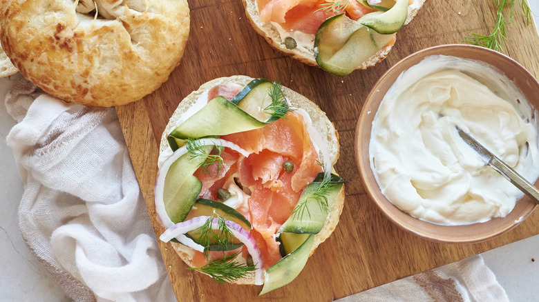 This loaded lox bagels comes complete with the works: salmon lox, onion, a cream cheese blend, and even some homemade pickles.