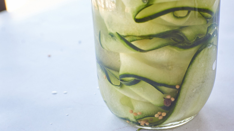 - Press the cucumbers down until they're submerged in the vinegar and let them sit until it's time to top the bagels.