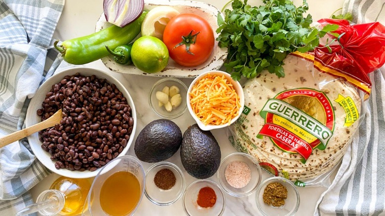 To make this recipe, head to the produce aisle first and pick up a white onion, garlic, an Anaheim chili, avocados, cilantro, red onion, jalapeño, lime, and tomatoes if you want to add those as a topper. Then we'll need some avocado or olive oil, black beans, and the spices which you may have on hand, are chili powder, cumin, salt, and smoked paprika. "You can use regular paprika here if that's what you have, but you'll give up some of the smoky flavor," Hahn shares. Then grab some shredded cheddar cheese and medium sized tortillas. If you want to make this meal dairy free, just use a dairy free cheese or omit it altogether.