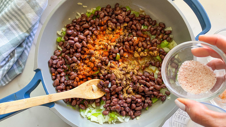Now add the beans, chili powder, cumin, ½ teaspoon salt, smoked paprika, and ½ cup of broth. To soften up the beans, reduce the heat to low and cook for 15 minutes. "Check the pan often just to make sure there is ample liquid to keep the mixture from sticking to the pan," Hahn remarks. After they have softened, pull out a potato masher or a wooden mallet and mash the beans into a chunky mixture, leaving some of the beans whole so you have a mix of textures.