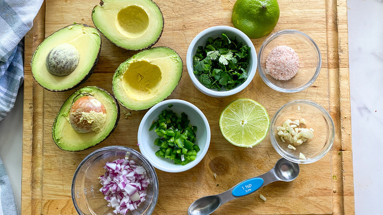While the beans are cooking, you can quickly whip up the guacamole. Add the avocados to a large bowl and mash with a fork. Now we'll add the remaining garlic, cilantro, red onion, jalapeño, lime juice, and ½ teaspoon salt. Mix to combine, cover, and place in the fridge until ready to use. "This guacamole is my standard go-to mixture whenever I make Mexican food. It's so much better than the pre-made guacamole from the grocery store," Hahn shares.
