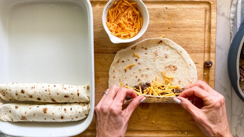 To roll the flautas, scoop out about 3-4 tablespoons of the bean mixture and about 1 tablespoon of cheese and place it in the bottom third area of the tortilla. Roll it up tightly leaving the sides open. As you roll them, place them into a 9x13-inch baking pan that has been sprayed with cooking spray. "You will most likely have to squeeze in that eighth flauta, which is fine because they don't need any space in between them when baking," Hahn tells us.