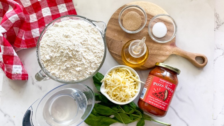 To make this recipe, we'll need some dough making essentials like warm water, active dry yeast, bread flour, avocado oil, and salt. Then you can either pick up plain tomato sauce or a jarred pizza sauce, some mozzarella cheese, and some fresh basil. "We're using bread flour here because it has a higher protein count which will give us more lift and rise in the dough, along with stability," Hahn shares.