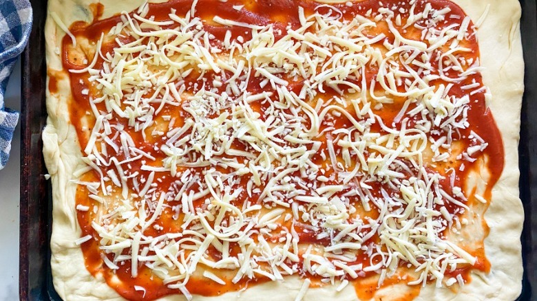 - Top the dough with the sauce and cheese. Bake the pizza in the oven for 15 to 20 minutes or until the edges are browned. Cut the basil into slivers and add to the pizza. Cut the pizza into square slices and serve.