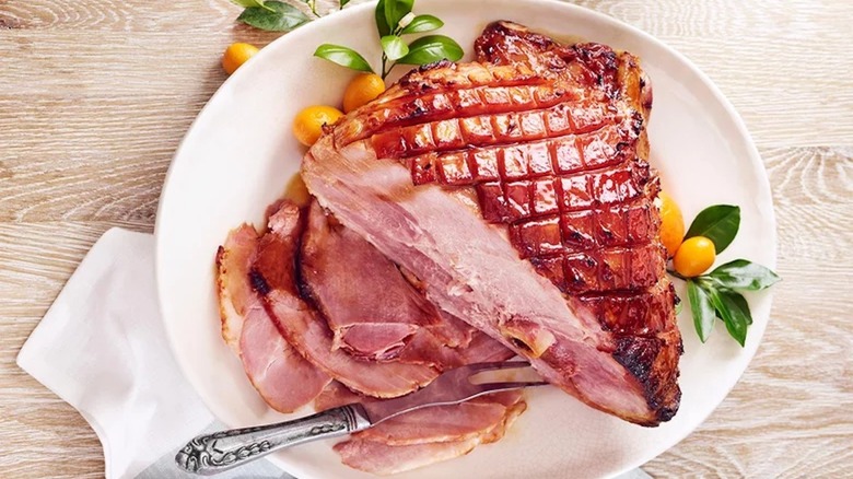The deep flavor of dark bourbon meets the caramelized essence of brown sugar and molasses in this boozy sweet glaze for an Easter ham. Bourbon is poured over a scored ham before it bakes in the oven, infusing the naturally sweet pork with notes of barrel-aged vanilla. The flavor builds as the glaze made from sweet molasses, tangy orange juice, brown sugar, and dijon mustard coats the ham and forms a full-flavored crust.