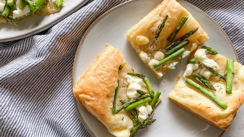 Not only do these asparagus tarts look elegant on the table, but they also have a delicate flavor and texture to match their presentation. Frozen puff pastry creates the flaky, butter-rich base for tangy bits of goat cheese and cut asparagus spears teeming with vegetal, earthy flavors. A sprinkle of chopped thyme brings notes of herbal lemon to the tart, adding complexity to the flavor profile.