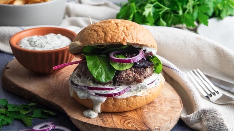 Lamb is a fancy Easter meal, but a whole roast can be too much when you want to keep it casual. Enter the burger, complete with lamb's signature gamey flavor and juicy texture. The lamb patties are seasoned with red onion, garlic, mustard, and mint before they're grilled and placed on a toasted bun. Toppings include snappy red onion, mixed greens, and an herby dill mayo spread that cuts through the robust, grassy flavors of the lamb.