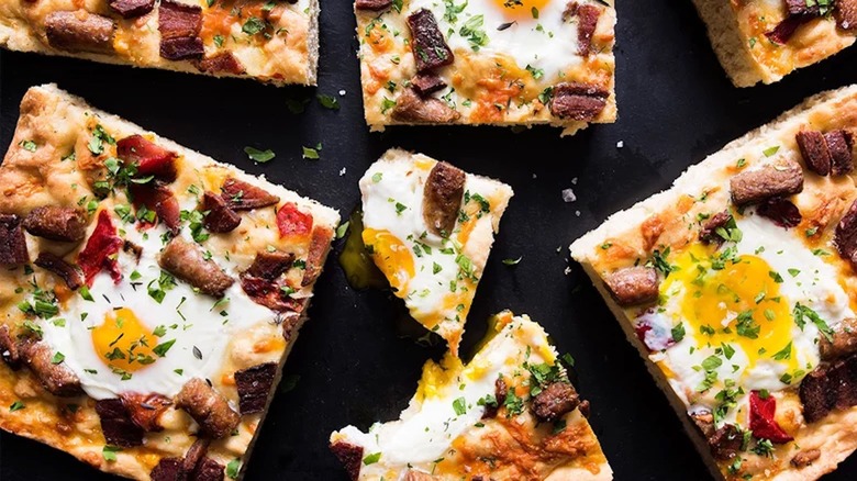 This flavorful Italian bread hosts all the breakfast flavors Easter guests want after an egg hunt. Sausage, bacon, and strips of roasted red pepper sit atop the focaccia while it proofs, imparting savory flavors to the simple dough. Balls of foil are pressed into the bread before it hits the oven, reserving a spot for whole eggs to sit. The final bake produces a breakfast bread complete with perfectly runny egg yolks that enrich each flavorful bite.