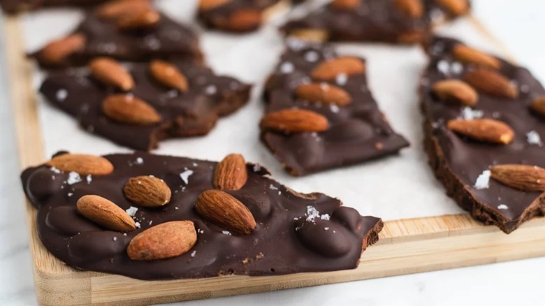 Roasted almonds are folded into melted dark chocolate before being spread on a sheet pan, where extra almonds are sprinkled on top for added texture. Then, flaky artisan salt is added to contrast the sweetness of the chocolate. Break the set chocolate into pieces and serve in a multitude of ways.