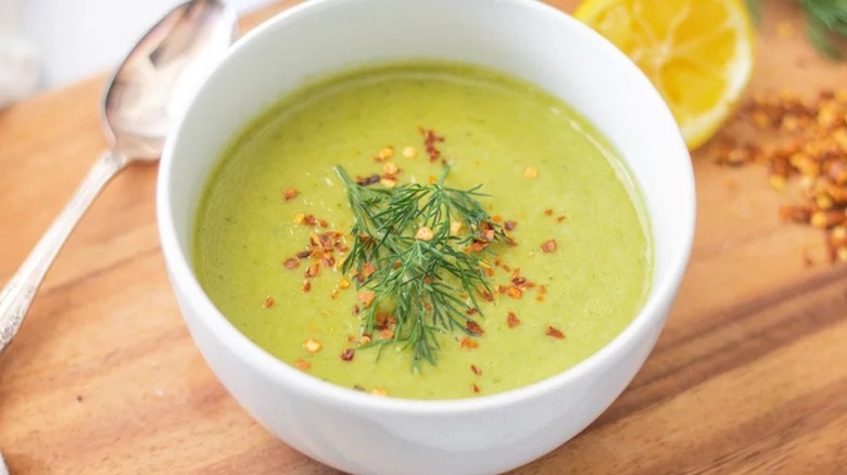 Half and half, lemon juice, and parsley are blended with the veggies and stock to create a light and creamy soup that is rich yet refreshing.