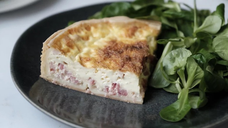 This simple recipe for quiche Lorraine will make prepping for your Easter brunch easy without losing any elegance. Savory pieces of thick-cut bacon and a sprinkle of nutmeg season the creamy egg custard to perfection as it bakes in a store-bought pie crust. While it's in the oven for 40 minutes, you can enjoy friends and family celebrating the springtime holiday.