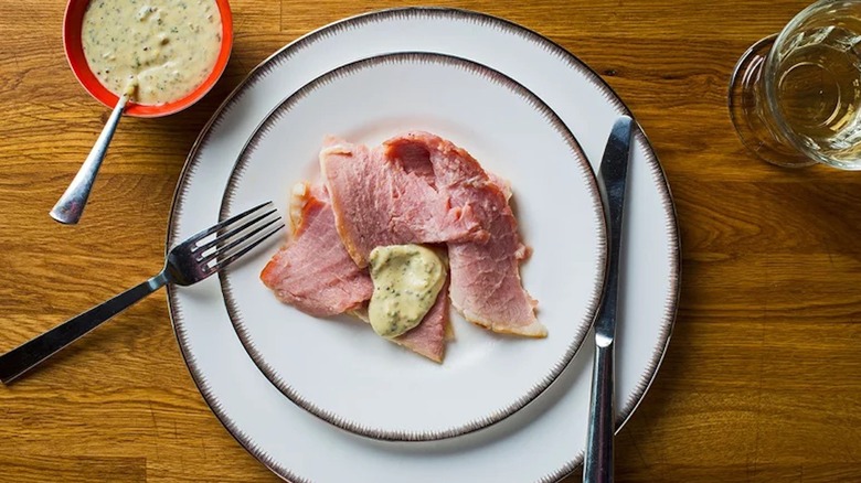 The complementary enhancements keep coming when a slice of tender ham is served with a dollop of herbal créme fraîche mixed with salty capers, piquant mustard, parsley, and thyme.