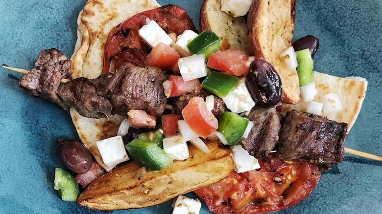 Greece goes all out for Easter, and this recipe for savory lamb souvlaki follows suit with big flavor. This beloved Greek street food starts with a simple marinade of olive oil, oregano, salt, and garlic powder that coats tender cuts of lamb before being skewered. After a quick sear on the grill or griddle, the lamb kebabs are placed on a traditional Greek salad made with oregano-seasoned tomatoes, kalamata olives, green peppers, and tangy feta cheese tossed in quality olive oil. Serve with warm pita bread and celebrate Easter with a classic Grecian meal.