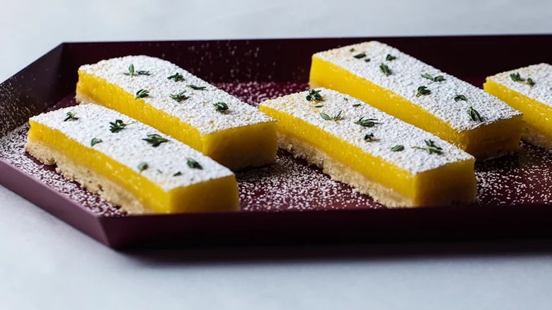 The hidden Easter egg in this refreshingly rich treat is the herbal essence of thyme balancing the sweetness of these lemony dessert bars. Almond flour joins all-purpose flour and a hefty amount of butter to create a delicate crust for the tart lemon curd infused with a sprig of thyme. Bright lemon flavors play off the savory herb, modernizing the classic treat with surprisingly complementary flavors.