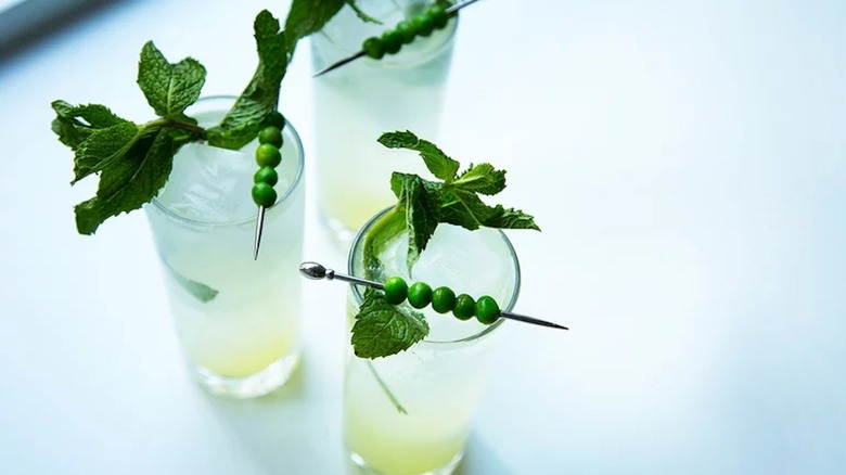 Garnish with skewered green peas and a sprig of mint to denote the unique ingredients in this spring pea mojito.