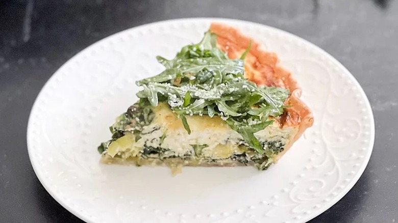 An Easter spread isn't complete without a quiche, especially when it features the fresh flavors of a new season. Simplify your to-do list and use a pre-baked pie crust, then fill it with an egg custard boasting spring flavors from sautéed leeks, earthy spinach, and tangy goat cheese or feta. The rich quiche is lightened with a bitter arugula salad topper dressed with a simple vinaigrette that balances rich flavors with a kick of bitter, peppery green notes.