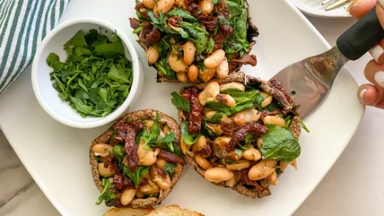 Wellness coach and recipe developer Miriam Hahn brings us this recipe for stuffed portobello mushrooms and says, "I enjoy all varieties of mushrooms and buy them every week." As to why she enjoys this particular recipe, which utilizes portobellos as a sort of vehicle, she says, "I love this recipe because it combines savory mushrooms with slightly sweet shallots and buttery cannellini beans along with the tangy sun-dried tomatoes. It's a delicious combination and can be a eaten for lunch or dinner on its own, or paired with a simple soup like this spinach soup and sourdough bread." It's a great meal that can be made in under 30 minutes, and even if you aren't vegetarian or vegan, there's no doubt you'll enjoy this veggie-packed dish.