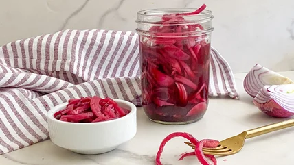 If you're looking to level up your next burger or taco, a tangy forkful of pickled red onions will definitely do the trick. They're easy to make with just a few minutes of active prep time and once made, they will last in your fridge for three weeks. Wellness coach and recipe developer Miriam Hahn brings us this recipe for sugar-free pickled red onions and says, "I love using onions in my cooking and always have all varieties on hand at all times. Pickled onions are so versatile and give everything you put them on an amped up flavor."